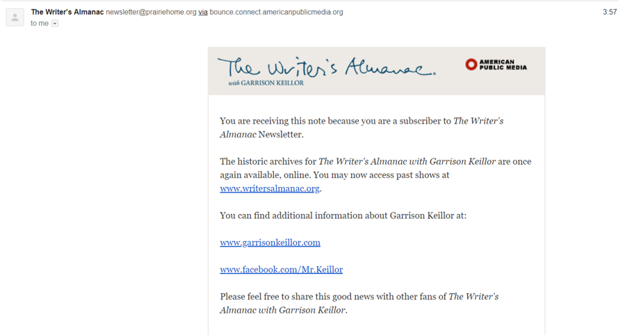 When I visited TheWritersAlmanac.org, the site was no longer there and redirected to a statement by MPR which included: